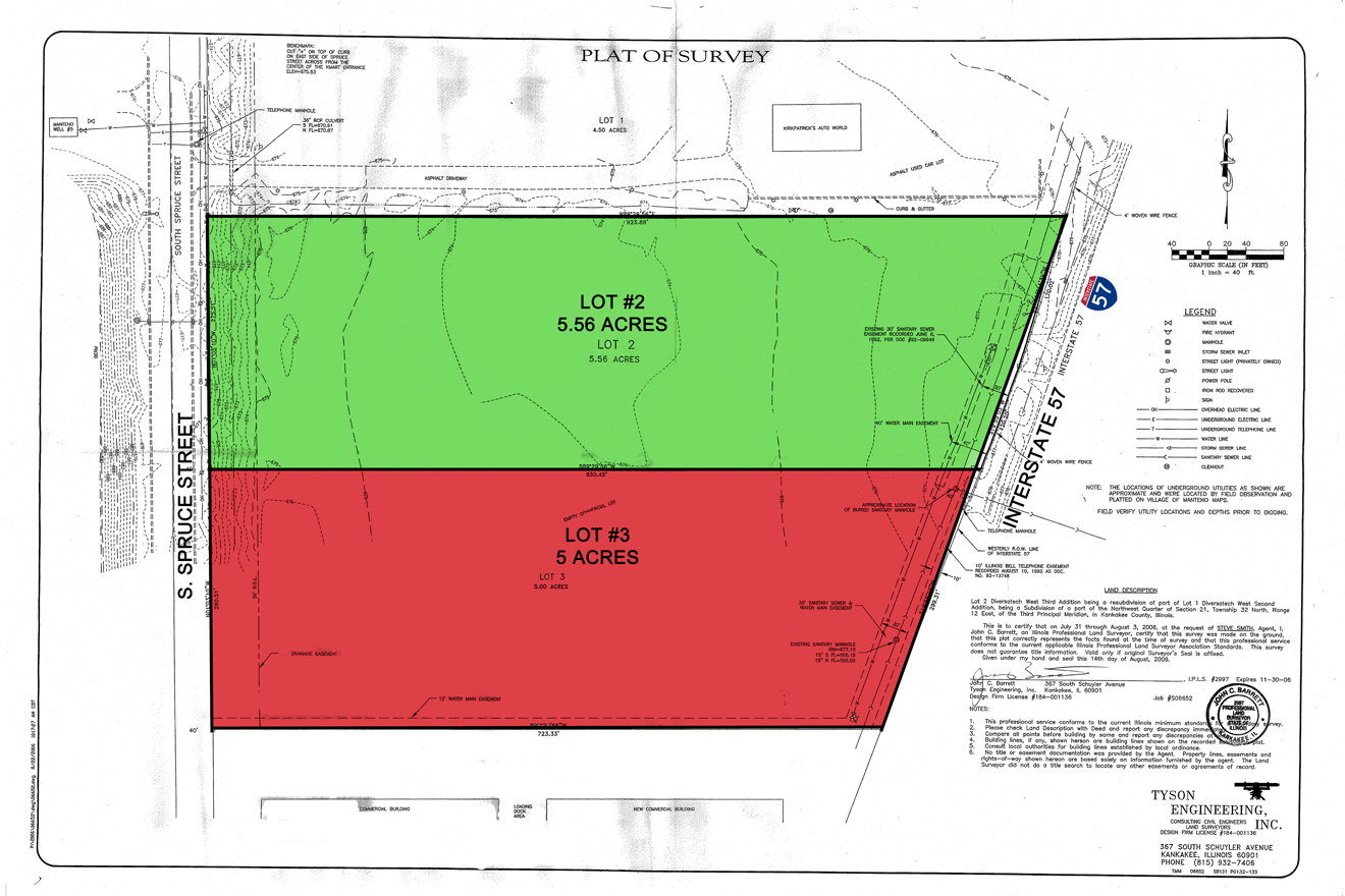 Total of 10.56ac or 459,994sf Lot #2 5.56 acres (242,194sf) Lot #3 5 acres (217,800sf) Village of Manteno, C-2 Zoning, City Water, Sewer, & Utilities to Site Under 1/2 mile to the I-57 & Division St Interchange Located Within the Kankakee County Enterprise Zone. Almost 600′ of I-57 Frontage Over 32,700 VPD I-57 LOT #2 (5.56AC) & LOT #3 (5AC) S. Spruce St Manteno, IL 60950 FULLY DEVELOPED COMMERCIAL LOTS Village of Manteno C-2 Zoning Water, Sewer, & Utilities to Site Under 1/2 mile to the I-57 & Division St Interchange Located Within the Kankakee County Enterprise Zone Almost 600′ of I-57 Frontage Over 32,700 VPD I-57