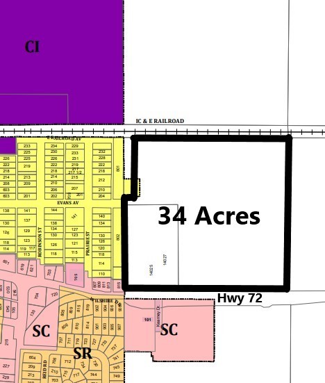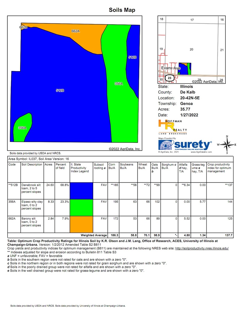 34.19 acres with excellent development potential on State Hwy 72 on the east side of the city of Genoa. Located adjacent to both commercial and residential. Future Land Use Map is High Density Residential. 2019 IDOT traffic count of 8,100 cars daily. Easy access to I-90 from State Hwy 23 interchange. Canadian Pacific Railway siding tracks on north side of property. Sanitary sewer and city water at property edge. Home and buildings included. Currently Agriculture with class A soils of Danabrook, Elpaso and Barony. Productivity Index of 137. PINs: 03-20-326-001 and 03-20-326-010.