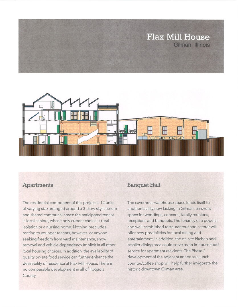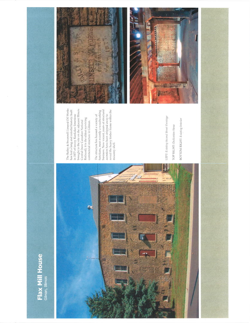 A piece of history being the oldest surviving commercial structure in Gilman – originally a flax mill -and several other businesses since. Currently empty the huge stone structure lends itself to banquet hall, restaurant, motel and many other innovative businesses